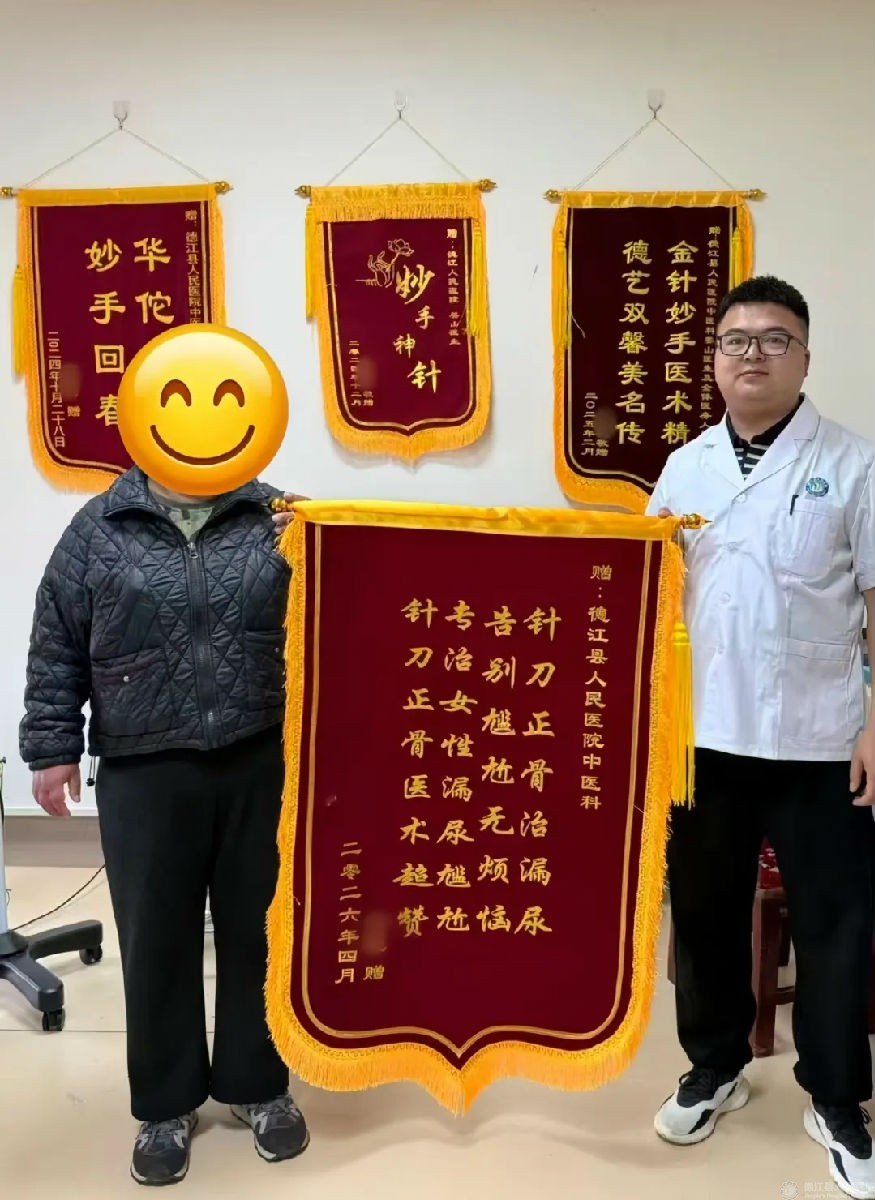 一位曾饱受产后漏尿困扰十年的女性患者,在科室针灸推拿特色门诊姜山医生与中医正骨特色田浩医生的精心治疗后,终于告别多年尴尬,重获干爽与自信。为表达由衷谢意,她特意将一面写有“针刀正骨治漏尿,告别尴尬无烦恼,专治女性漏尿尴尬,针刀正骨艺术超赞”的锦旗送到医生手中。